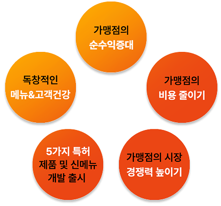 이를 위해 5종류의 특허기술이 들어간 제품을 가맹점 사장님이 사용하시기에 편리하게 제조 생산하여 공급하고 있습니다. 본사는 오랫동안 식품제조 기업을 자력으로 운영하여 왔기 때문에 가맹점 사장님께 가맹비 부담을 줄일 수 있었습니다.